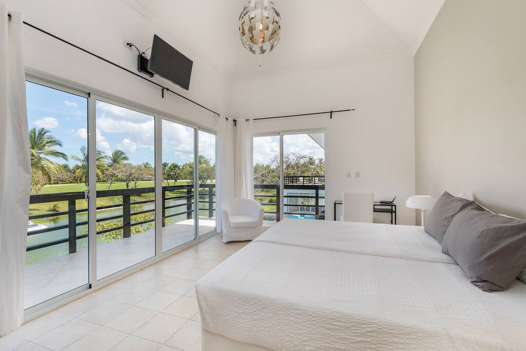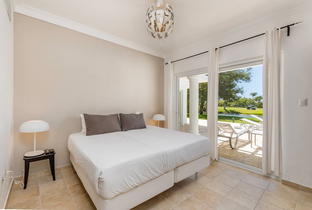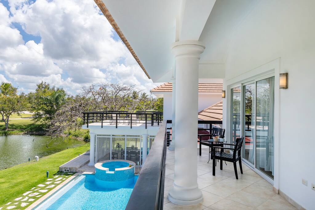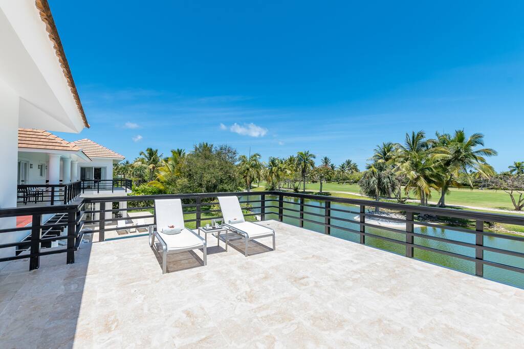 Upstairs you’ll find the remaining 5 bedrooms. One master bedroom is located inside the main house and has a large balcony with furniture where you can sit quietly and enjoy the incredible golf and lake views. The second master bedroom is located in the adjacent 2-story guest house with a large balcony and views of the pool, lake and golf course. The third bedroom inside the main house has direct access to the rooftop terrace (located above the screened-in patio) with sunbeds and a staircase leading down to the garden and swimming pool. The remaining 2 bedrooms in the main house are smaller and more private rooms without balconies.