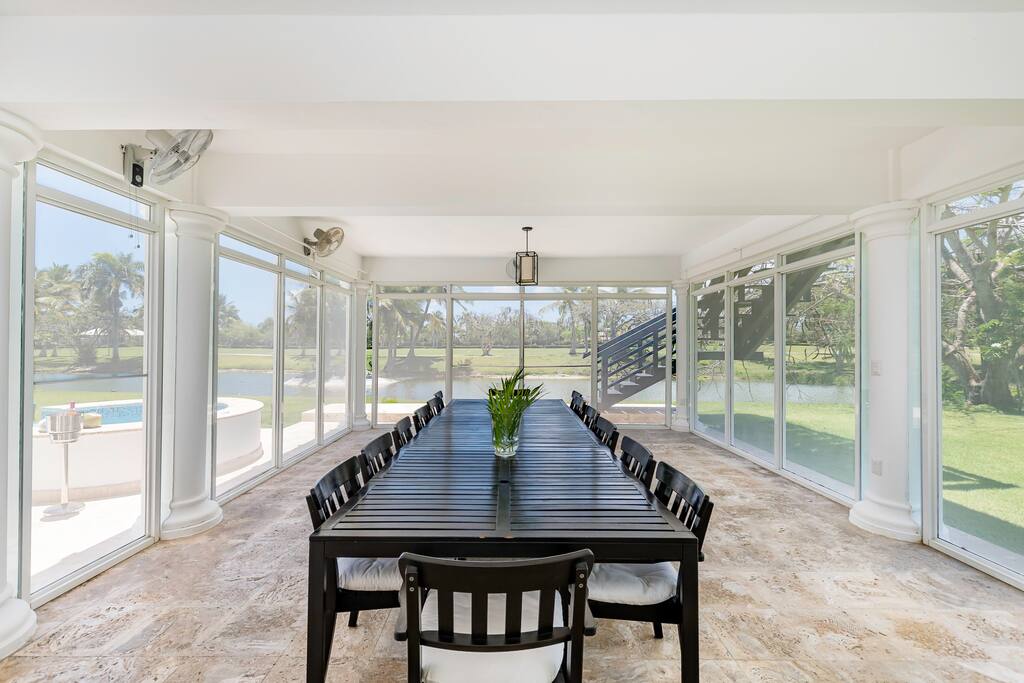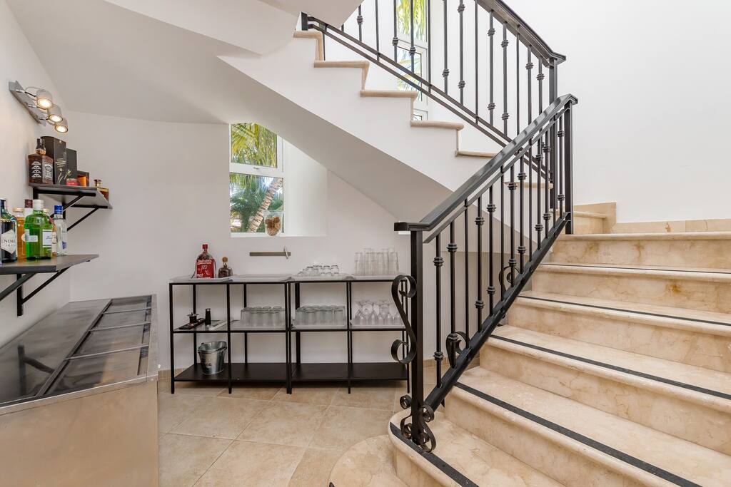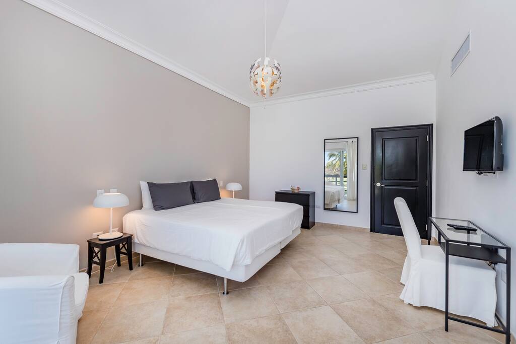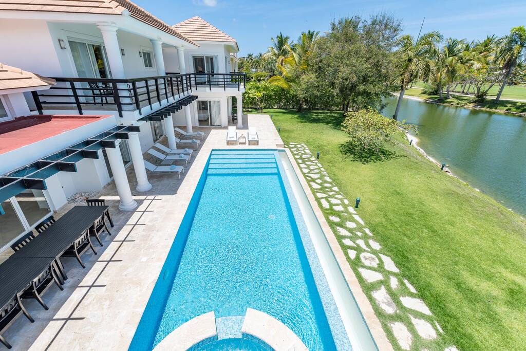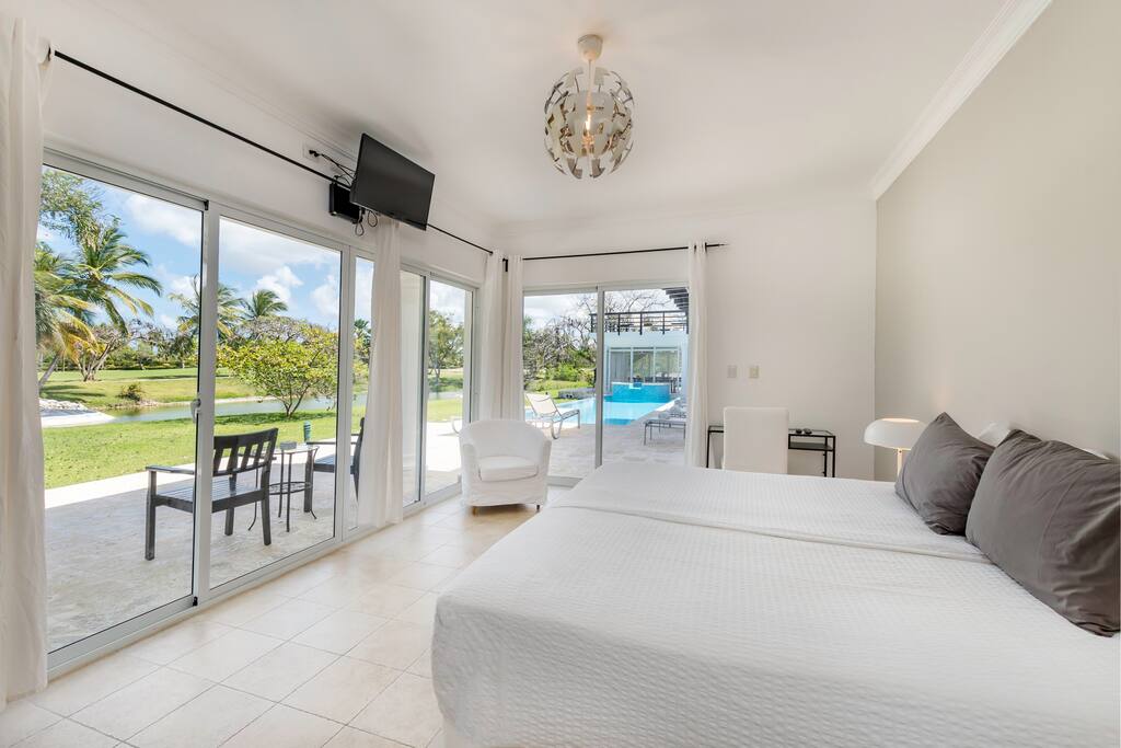 Upstairs you’ll find the remaining 5 bedrooms. One master bedroom is located inside the main house and has a large balcony with furniture where you can sit quietly and enjoy the incredible golf and lake views. The second master bedroom is located in the adjacent 2-story guest house with a large balcony and views of the pool, lake and golf course. The third bedroom inside the main house has direct access to the rooftop terrace (located above the screened-in patio) with sunbeds and a staircase leading down to the garden and swimming pool. The remaining 2 bedrooms in the main house are smaller and more private rooms without balconies.