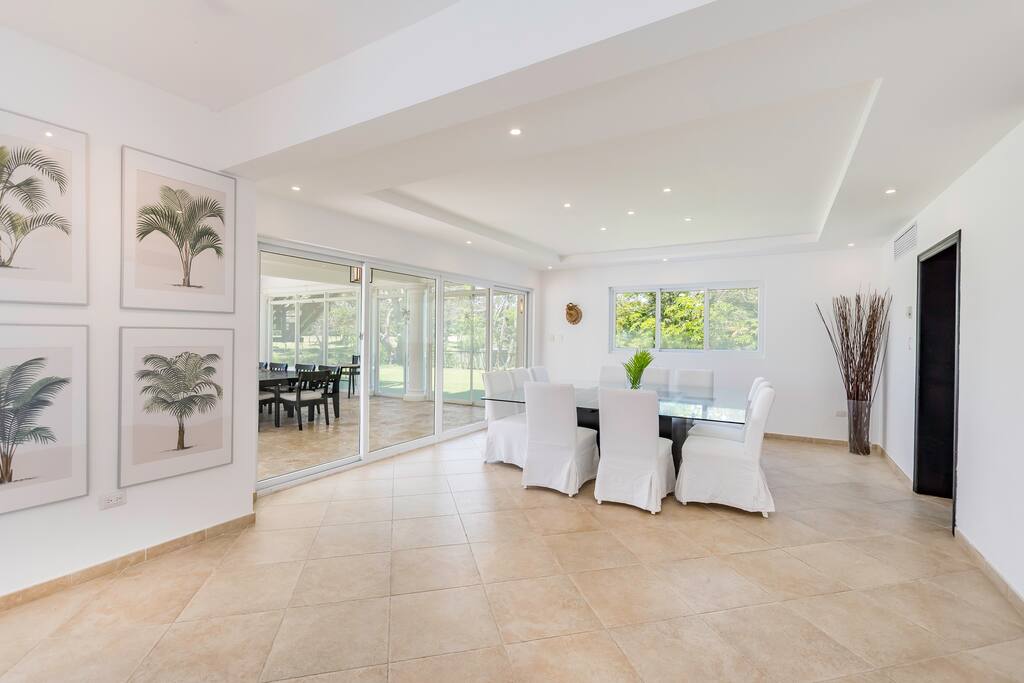 The living- and dining room is the place to lounge and entertain. This space has a 60-inch flat-screen television with cable TV and large, roomy sofas where you can relax and feel at home. The formal dining room is set up with a large dining table that seats 16 persons comfortably. Or, if you want to dine more casually, you can choose to enjoy your meals outside on the screened-in patio.