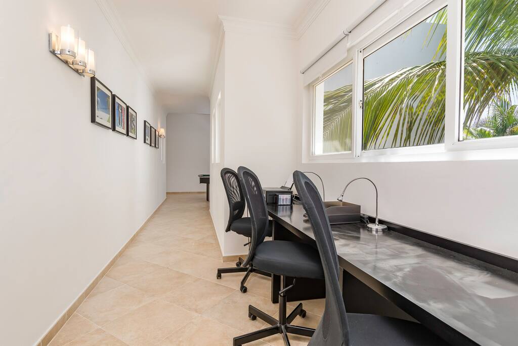 The upstairs area also has an office space with desk and 3 office chairs located in a small nook in the hallway between the bedrooms.