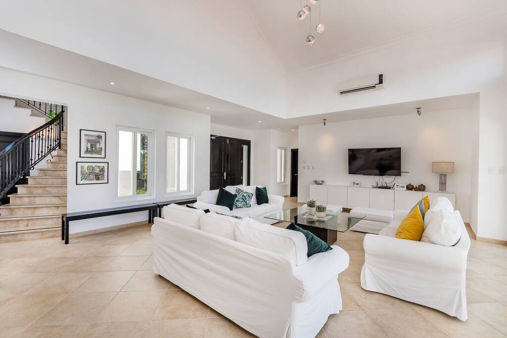 The interior is kept in a contemporary Scandinavian style, i.e. simple and minimal décor with all white furniture, which gives the space a clean and modern feel.