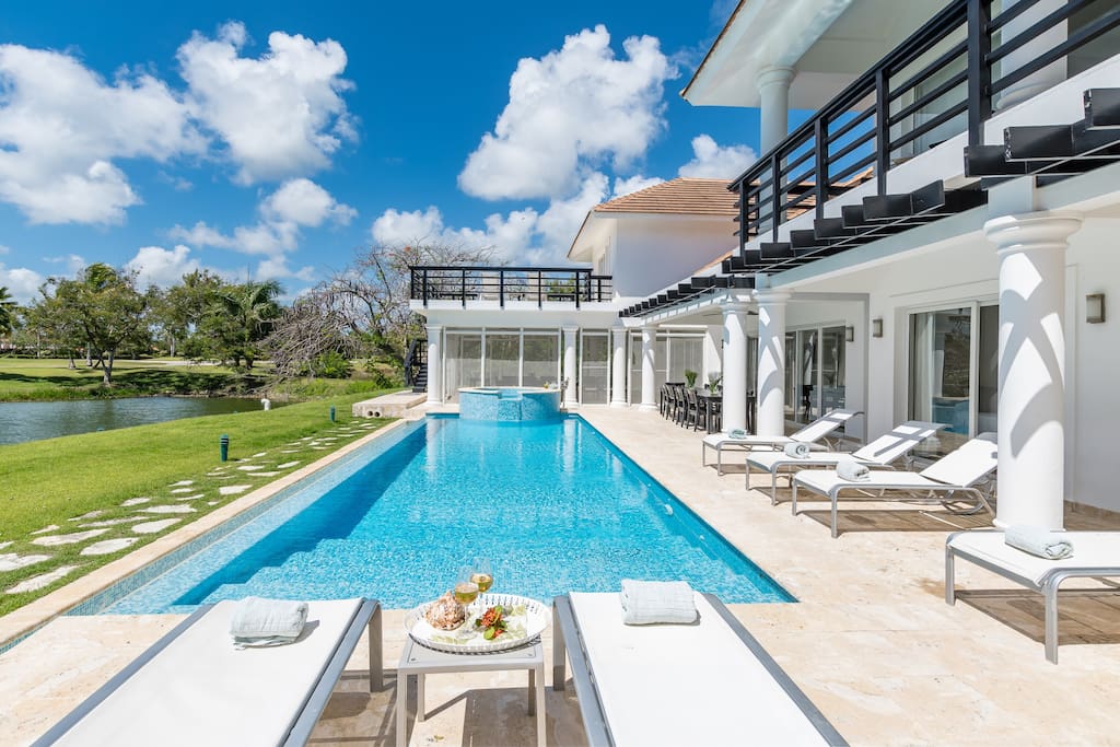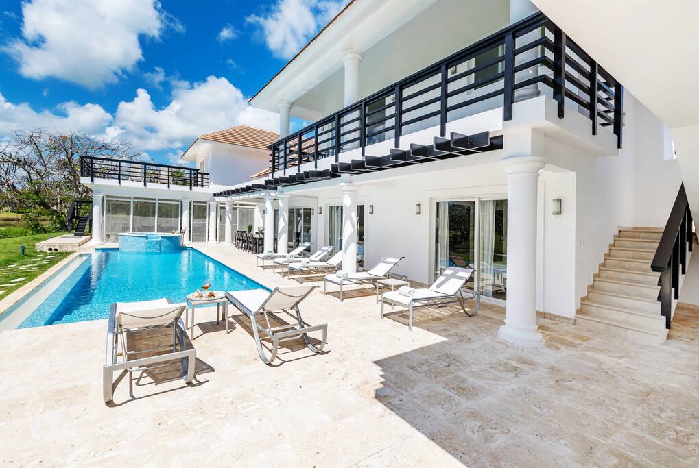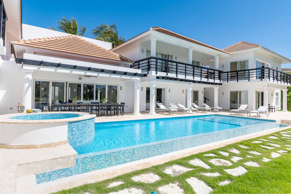 A gorgeous 8-bedroom villa built in 2 levels, with a large pool-side terrace, balconies and a rooftop terrace. You can enjoy your own swimming pool & Jacuzzi as well as a screened, outdoor dining room – perfect for those tropical dinners with your family & friends.