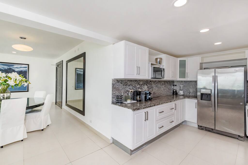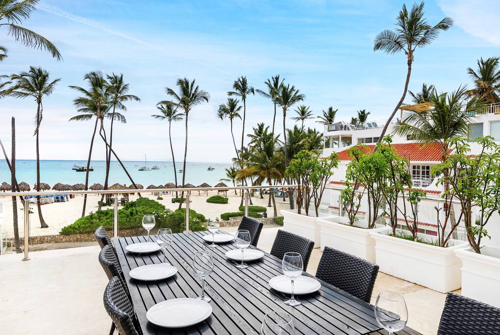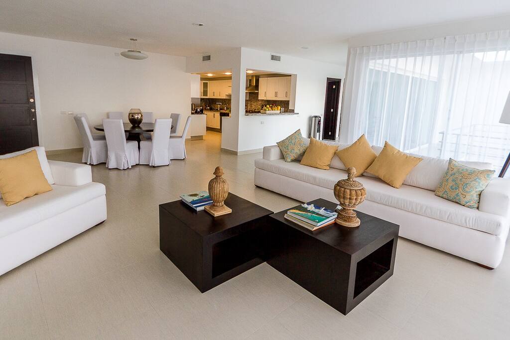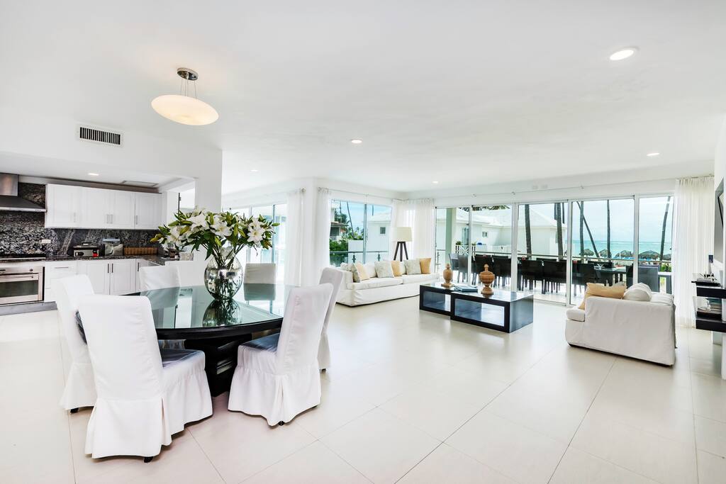 The living room and dining room feature breathtaking views of the beach and the Caribbean Sea with sliding doors that open for direct access to a large balcony with an outdoor dining table (seats 16 people). This is usually where our guests like to have their meals and enjoy the view.