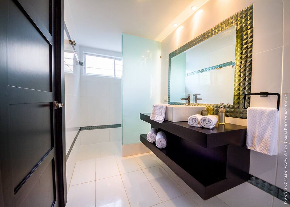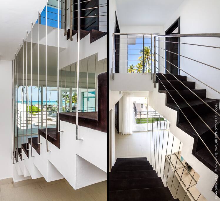 The 2nd floor has two impressive master bedrooms with king beds, walk-in closets, his/her bathroom, direct access to a large balcony with sunbeds and a spectacular ocean view.