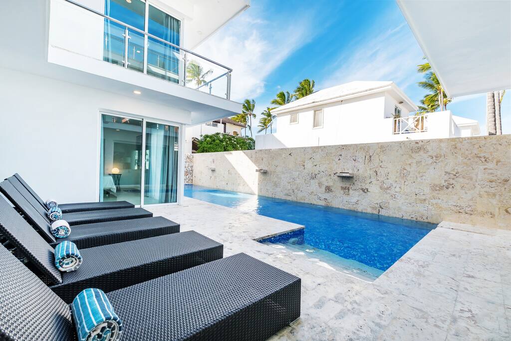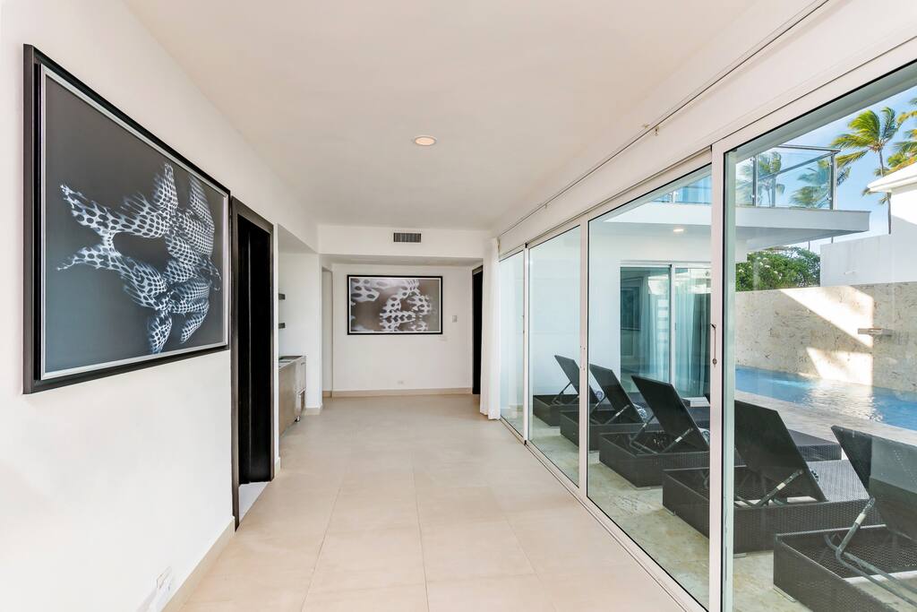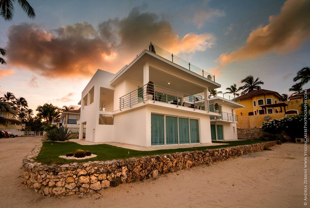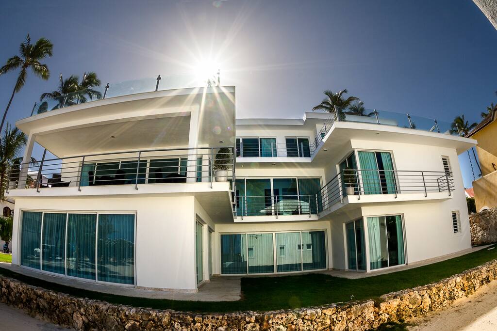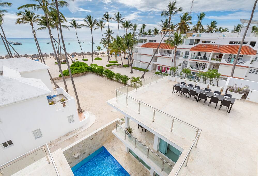 Our paradise villa has 8 bedrooms and is located directly on the magnificent Los Corales Beach in Bávaro within a few minutes walking from supermarkets, pharmacies, restaurants, bars, bakeries, small shops, spa & salon, gym, etc.