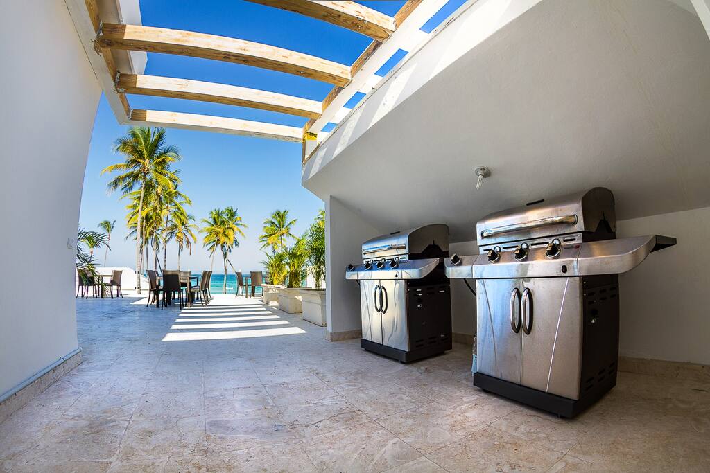 There is also another outdoor dining area on the balcony of the 2nd floor with a dining table (seats 16 people) and an outdoor kitchen area with 2 gas BBQ grills.