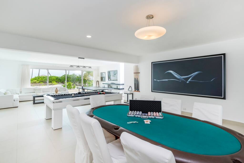 The Interior is kept in colors of black & white neutrals and with lots of space in the indoor and outdoor common areas where you can relax and play. PLAY may just be the operative word when you stay at the villa – the ground floor living room of the entire villa has been turned into your ultimate game room with a poker table, pool table, and ping-pong table.