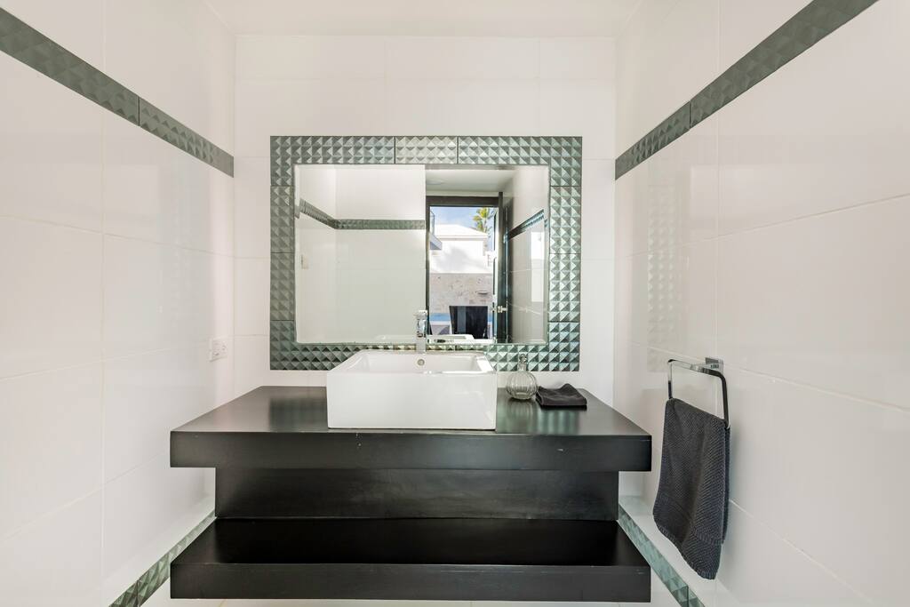 This villa has 8 bedrooms – 3 bedrooms on the ground floor, 3 bedrooms on the 1st floor and 2 bedrooms on the 2nd floor. All bedrooms have ensuite bathrooms with shower, TV, closet space and air conditioning. 3 bedrooms have “his & her” bathrooms (i.e. 2 bathrooms)!